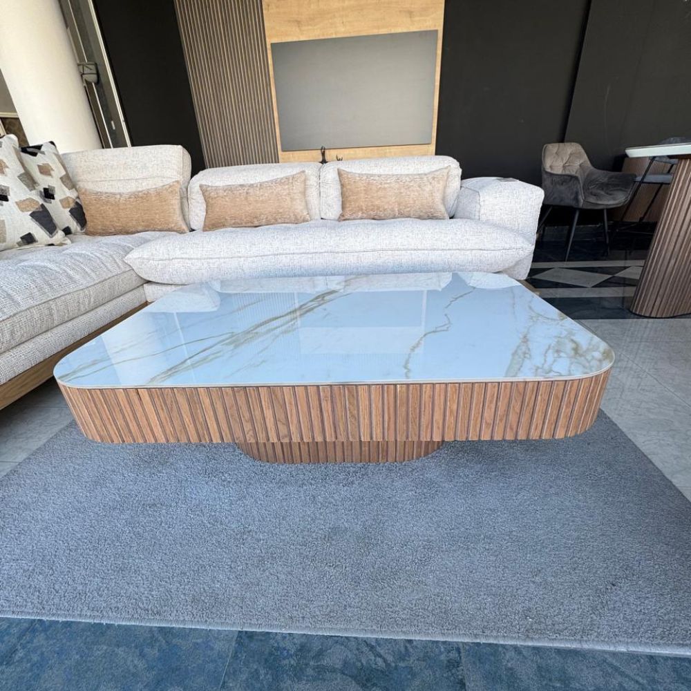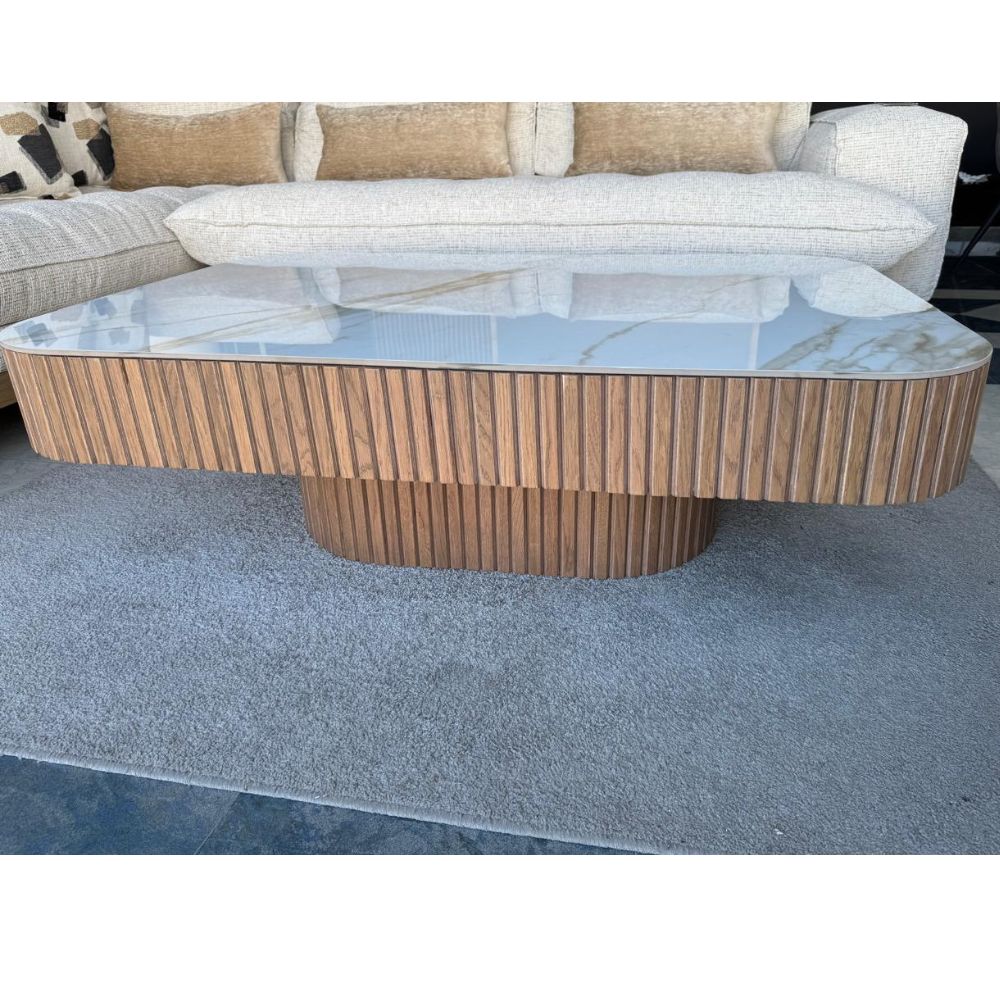 Ανακαλύψτε τη μοναδική συνύπαρξη φυσικής ομορφιάς και μοντέρνου σχεδιασμού με αυτό το τραπεζάκι σαλονιού. Η επιφάνεια από υψηλής ποιότητας κεραμικό προσφέρει ανθεκτικότητα και εύκολο καθάρισμα, ενώ το πλαίσιο από ζεστό ξύλο δρυός προσδίδει διαχρονική κομψότητα. Οι ξύλινες δοκίδες περιμετρικά δίνουν μια διακριτική αισθητική λεπτομέρεια, καθιστώντας το ιδανικό για κάθε σαλόνι που θέλει να συνδυάζει στιλ και λειτουργικότητα.